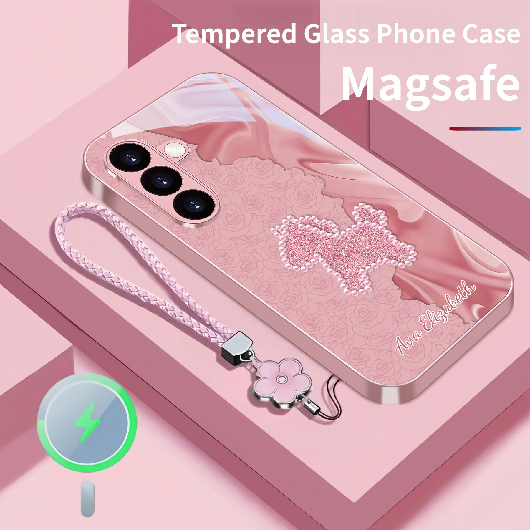 Personalized Gorgeous Butterfly Rose Magsafe Tempered Glass Case With Lanyard