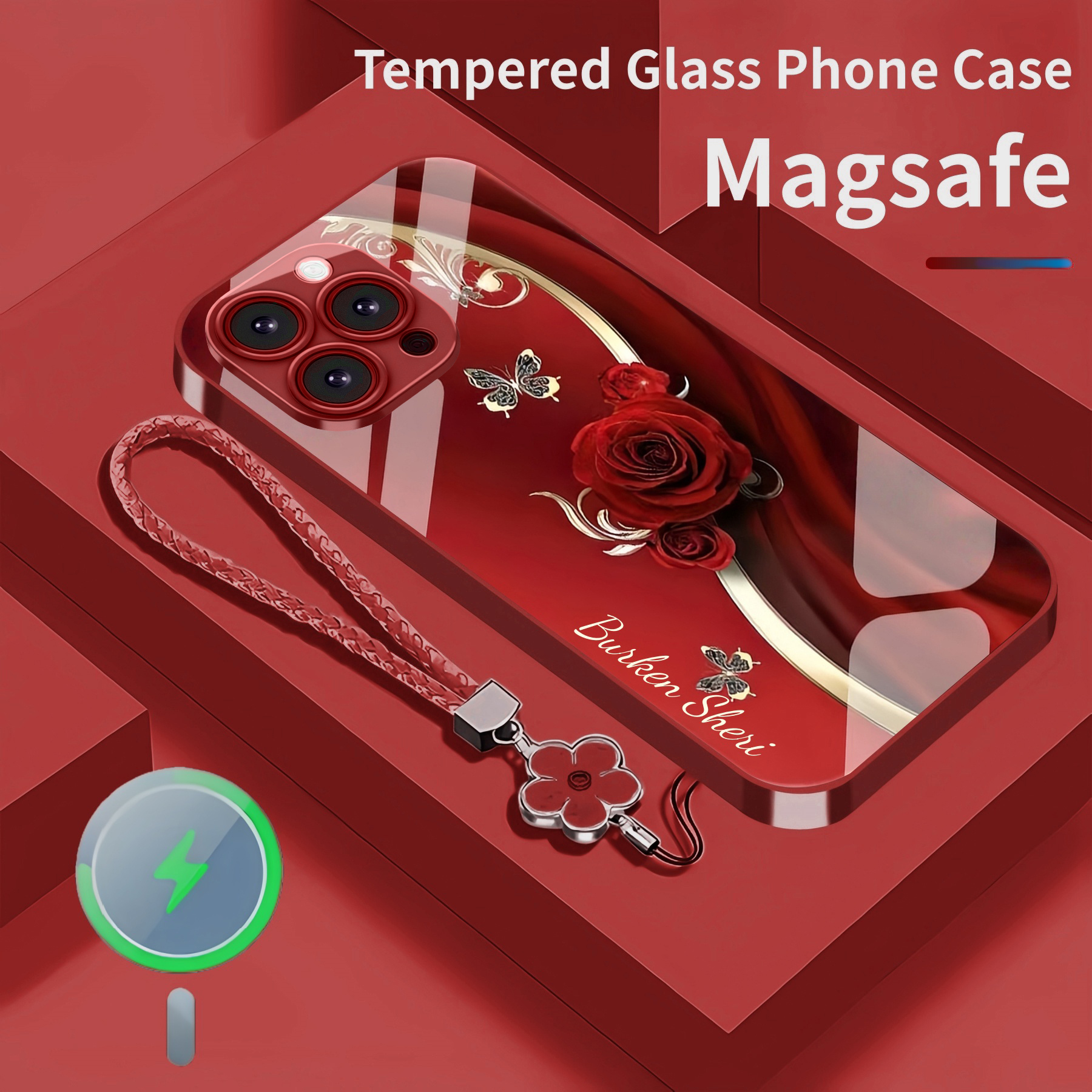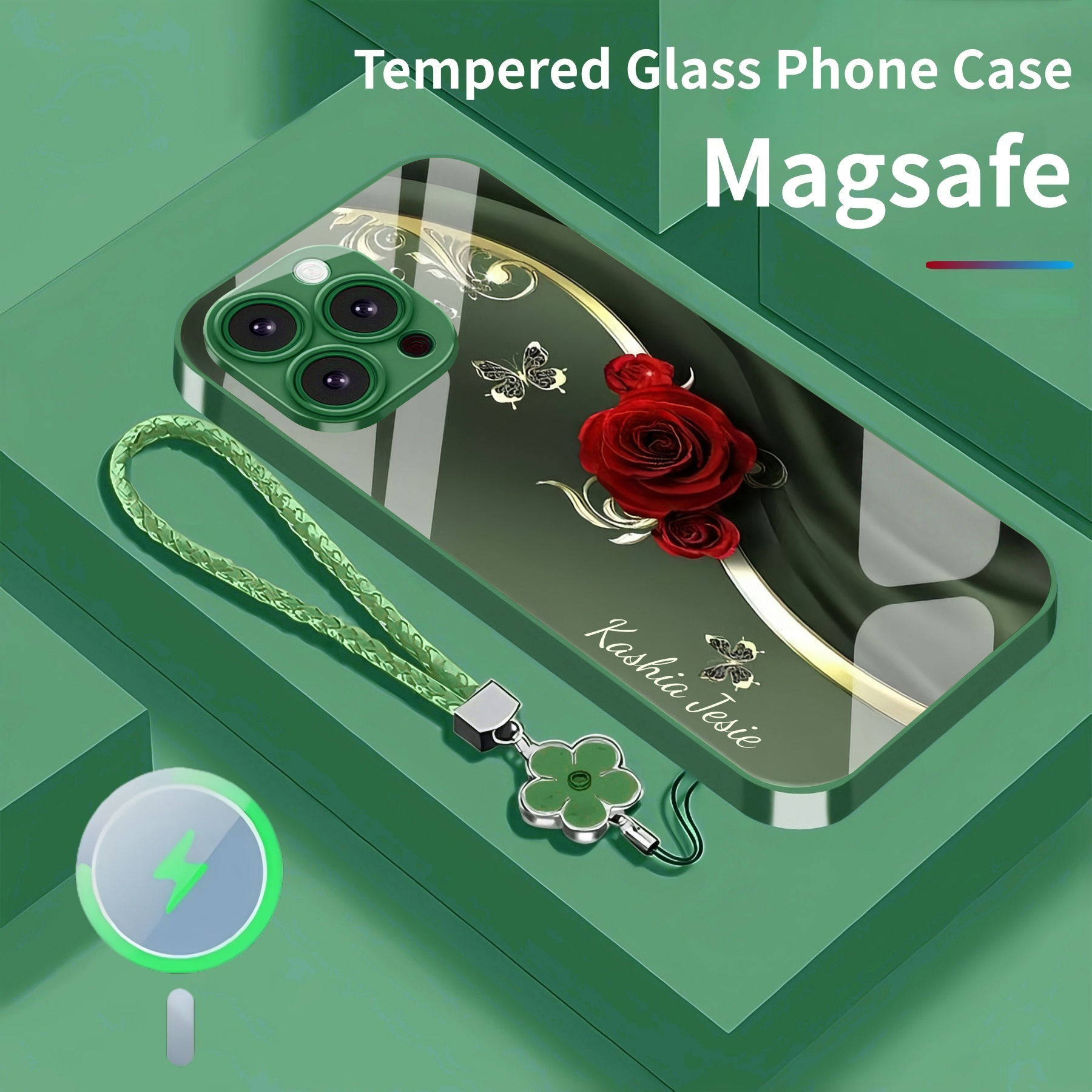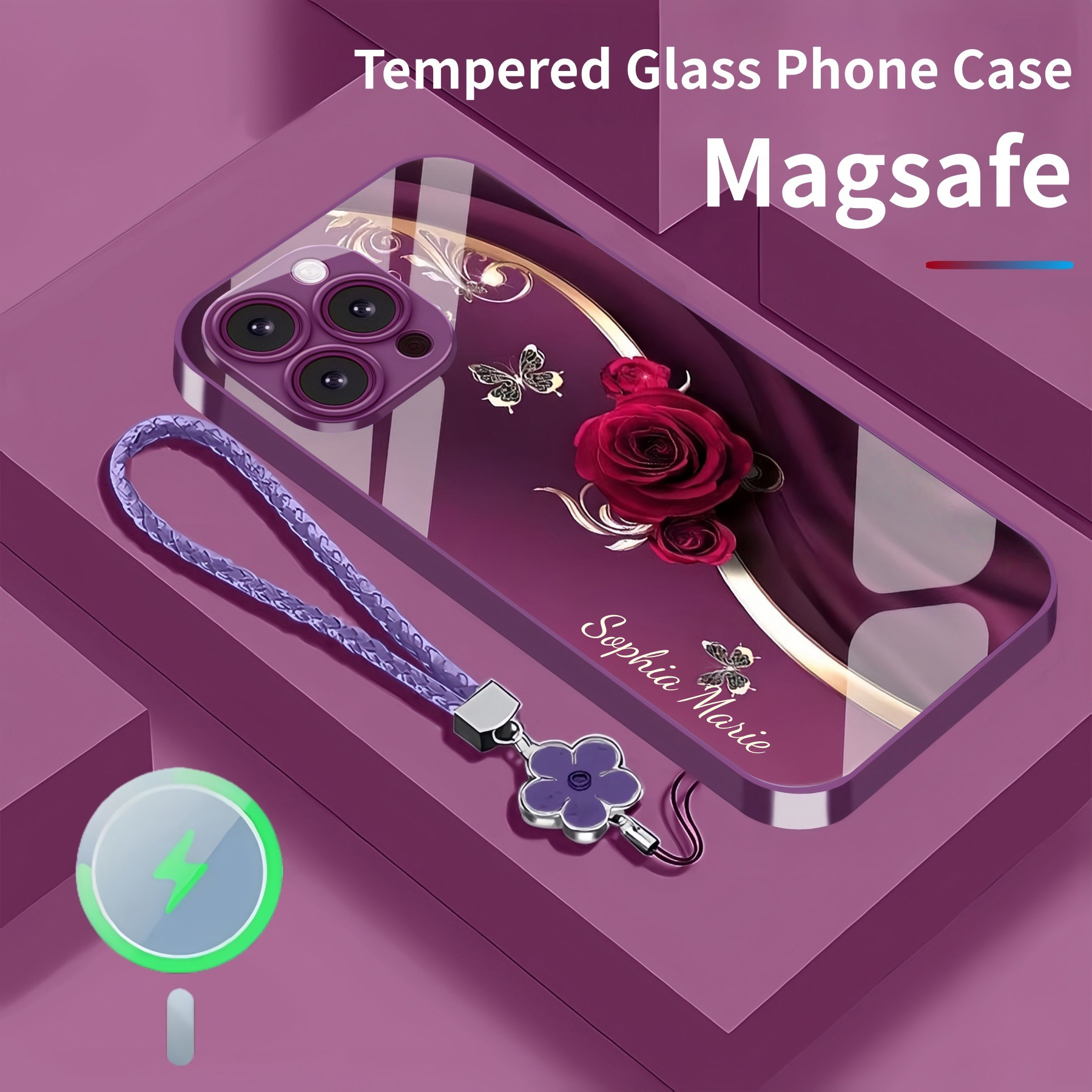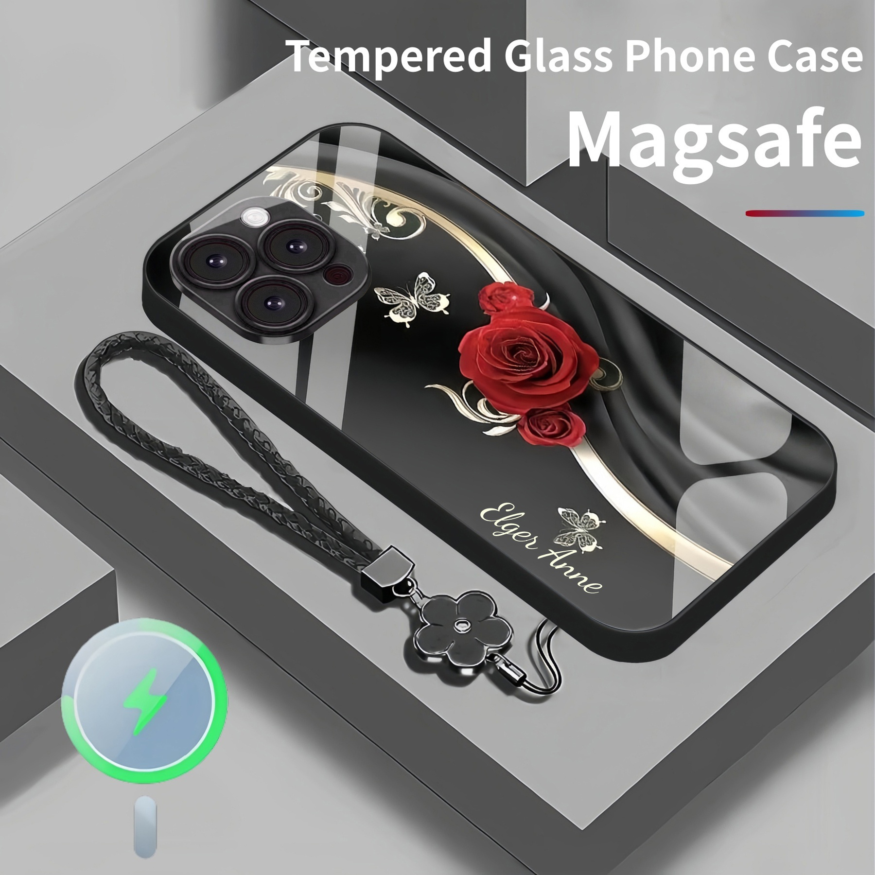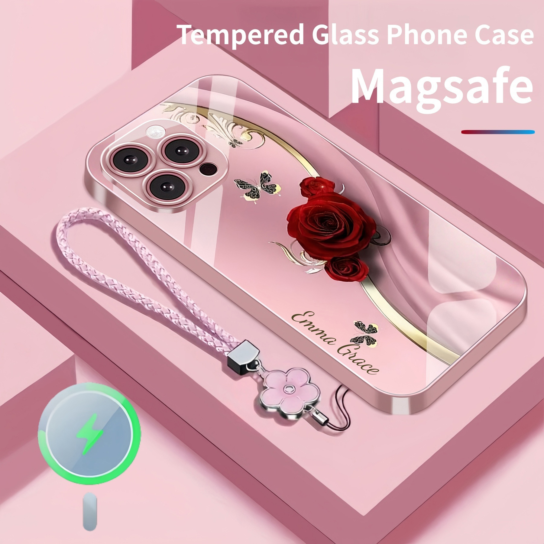 Personalized Elegant Rose Magsafe Tempered Glass Case with Lanyard