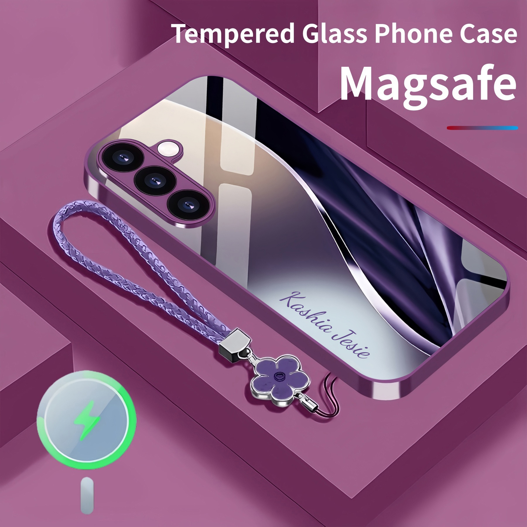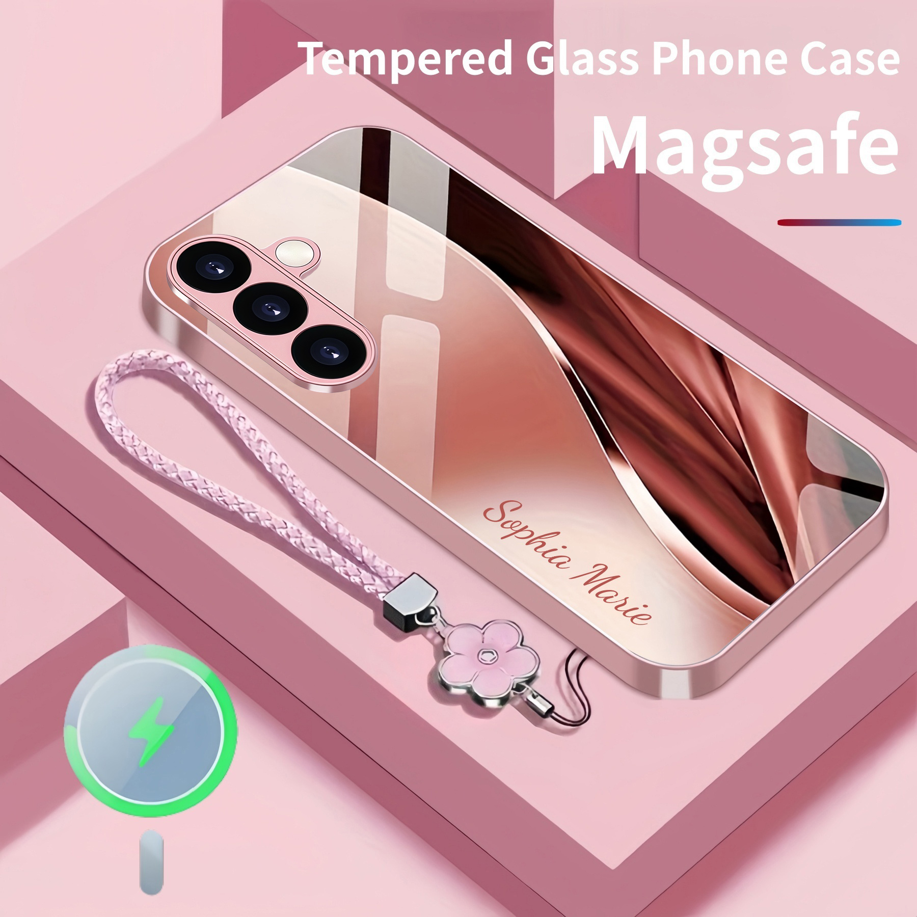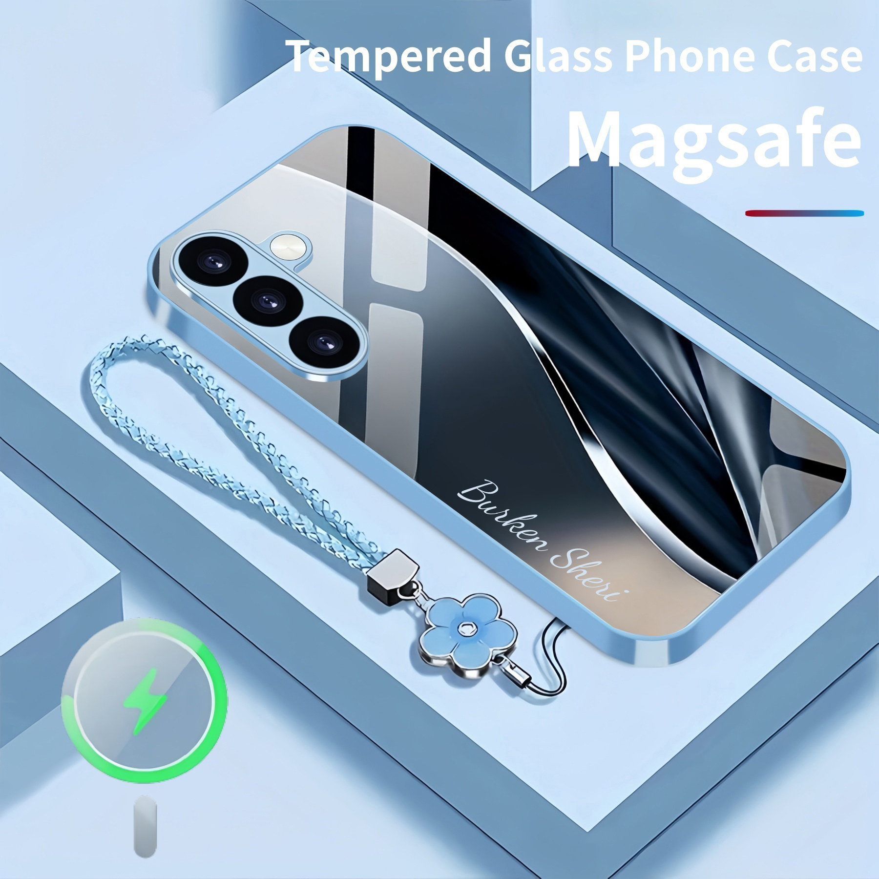 Personalized Simple Curve Magsafe Tempered Glass Case with Lanyard