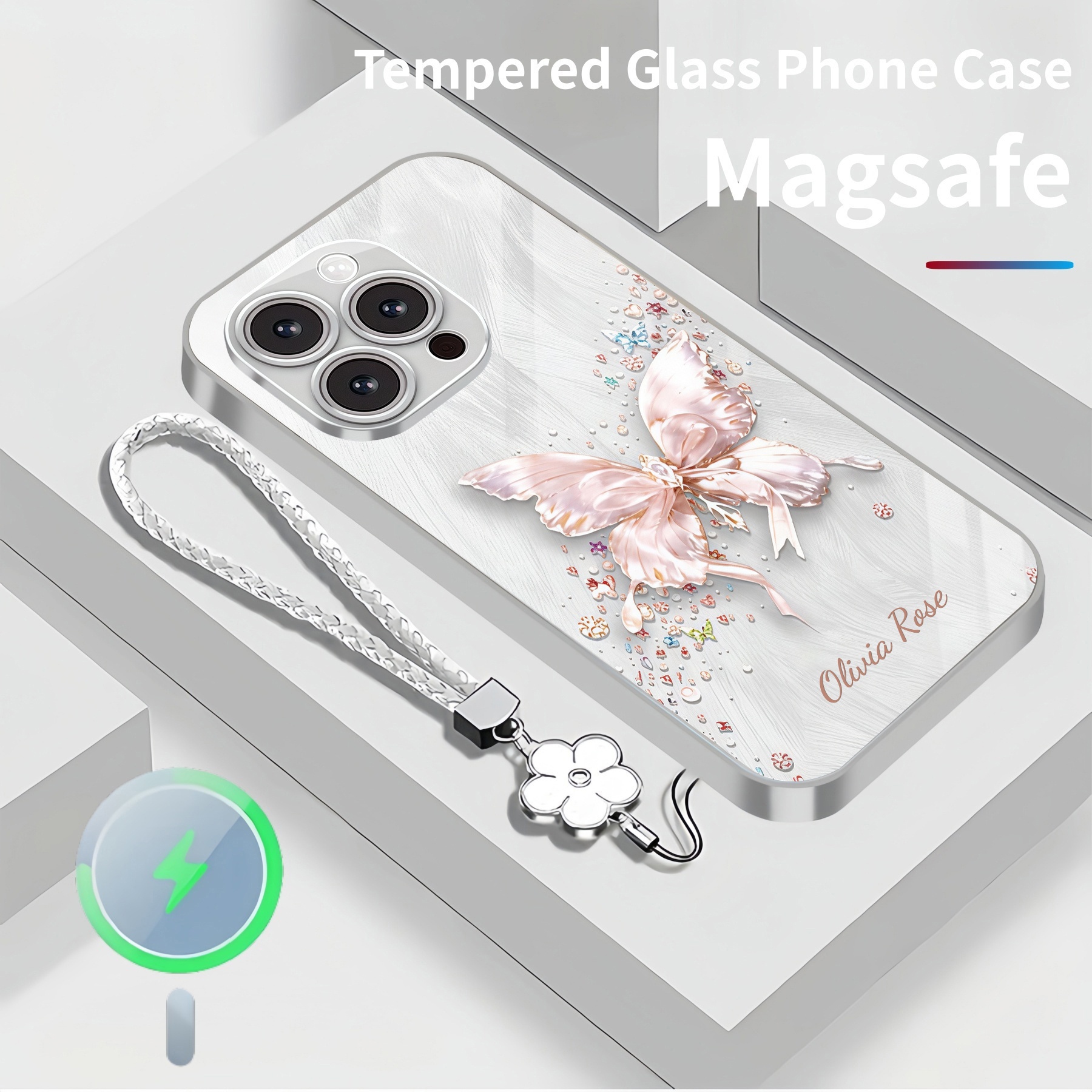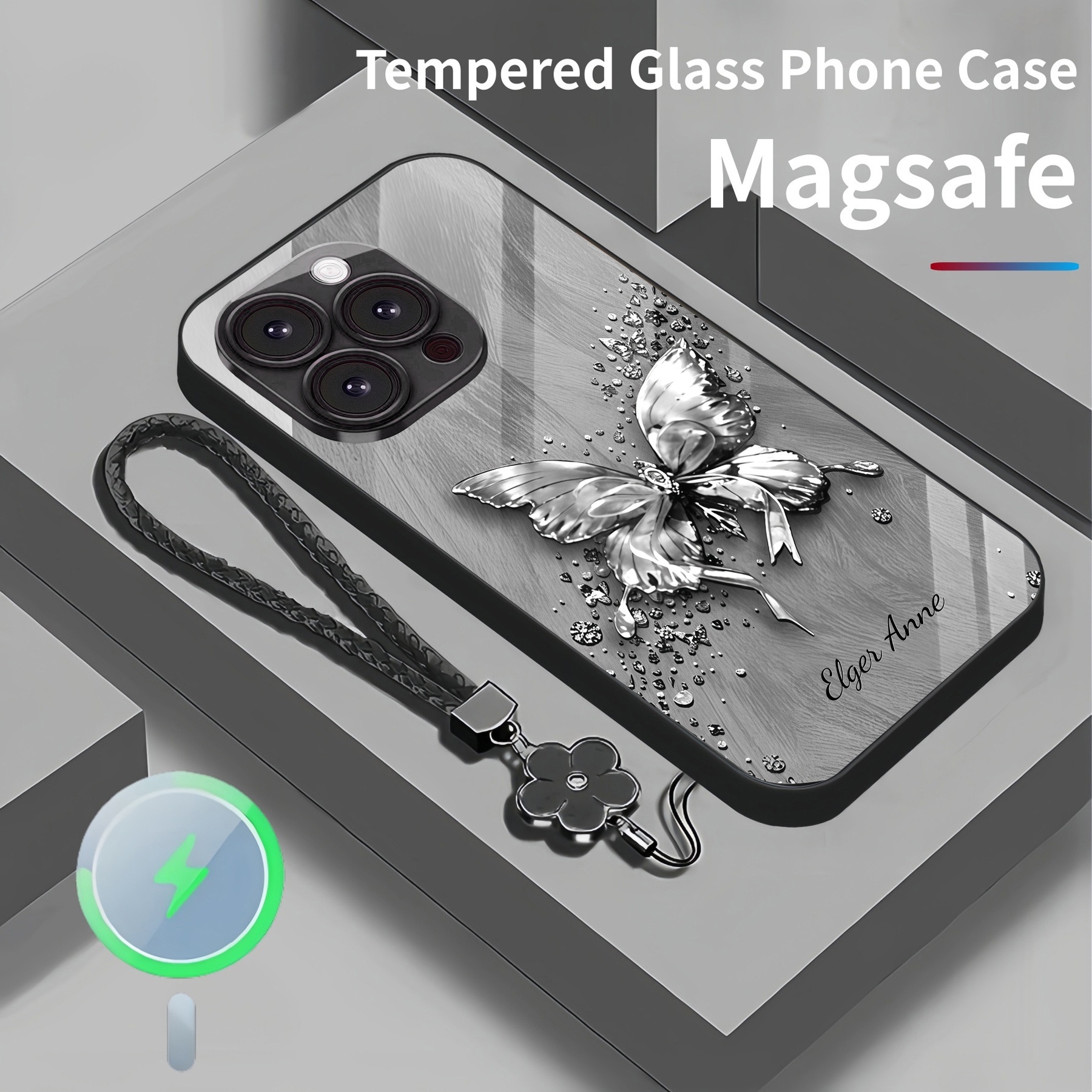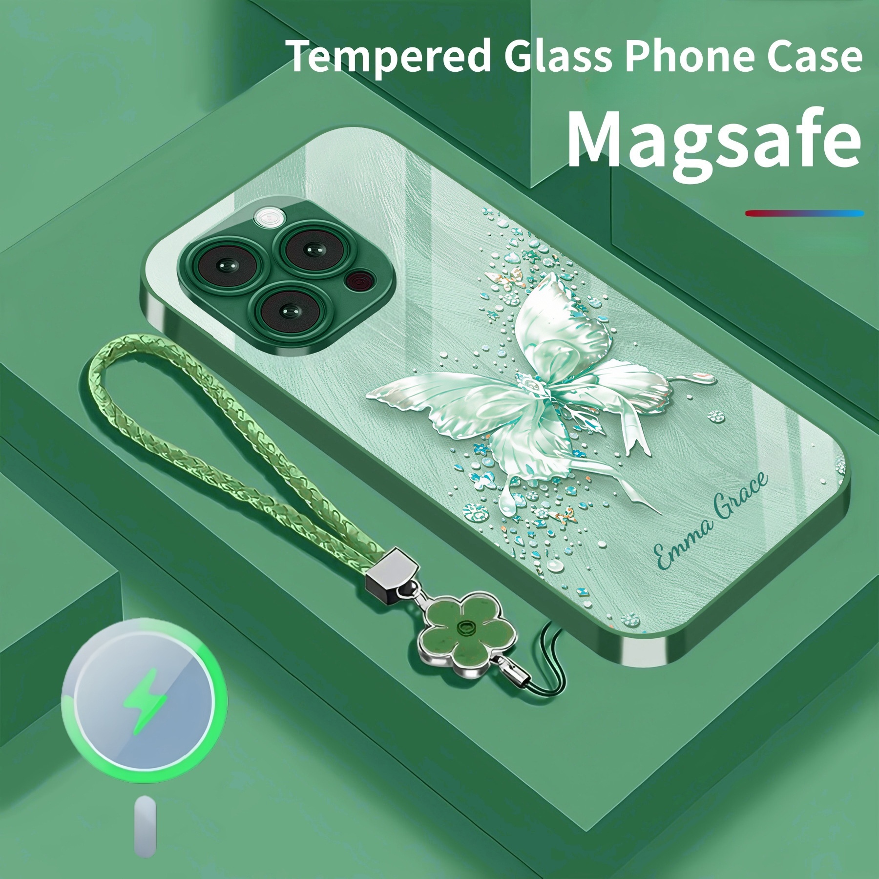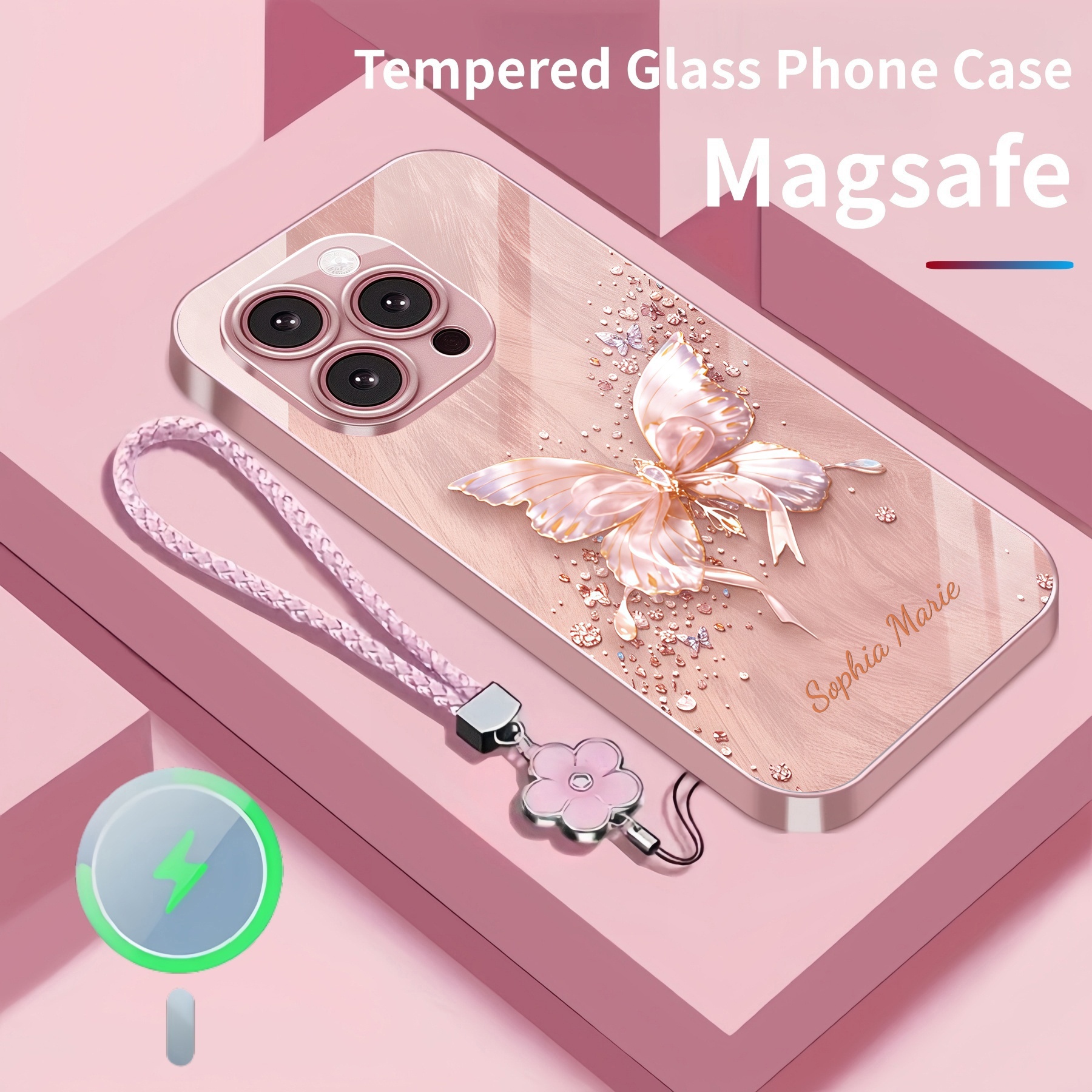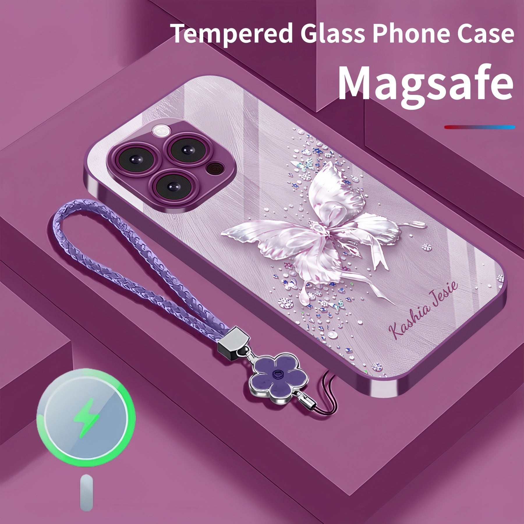 Personalized Crystal Butterfly Magsafe Tempered Glass Case with Lanyard