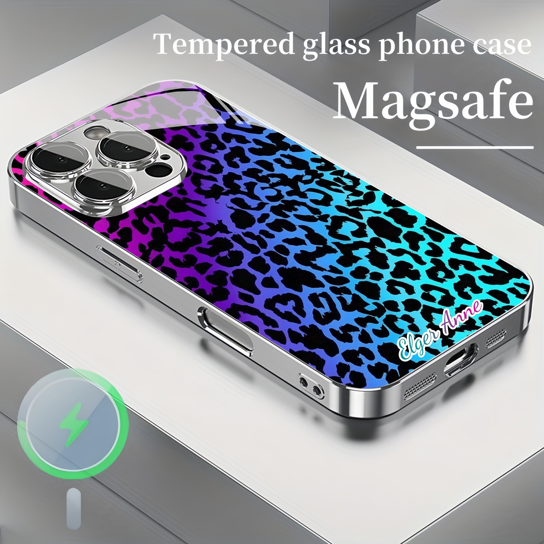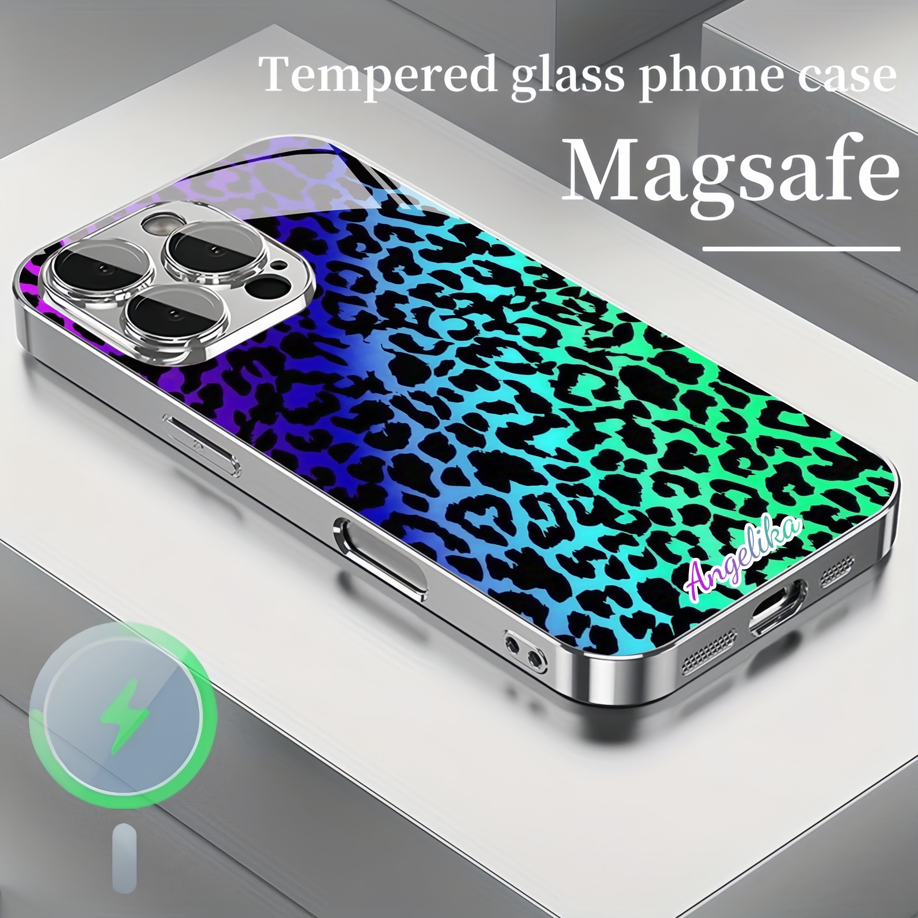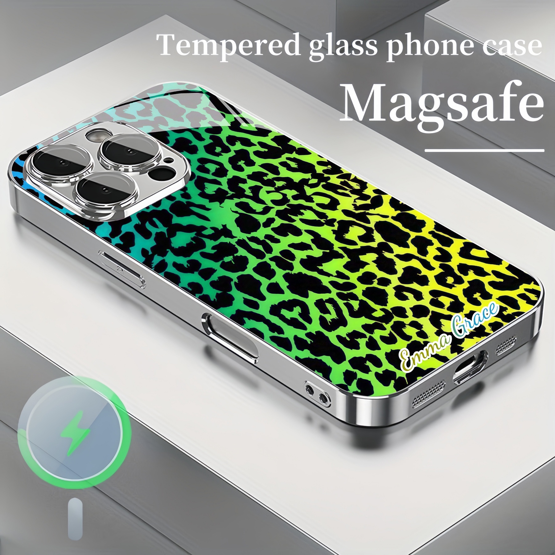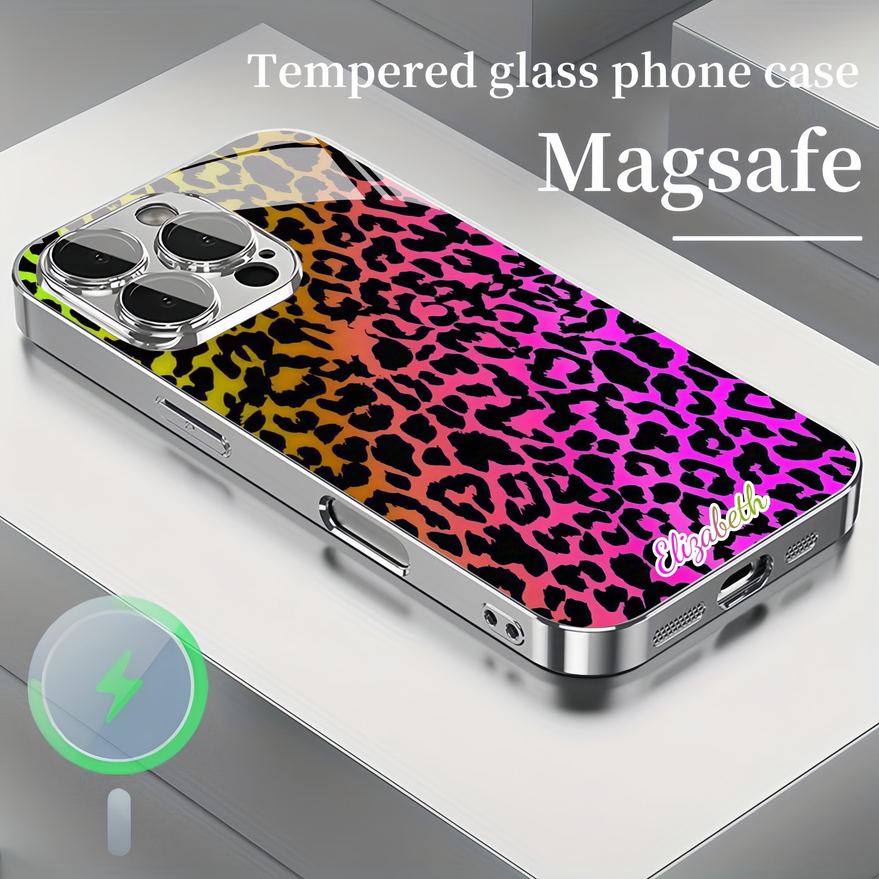 Personalized Rainbow Leopard Print Magsafe Tempered Glass Plating Case