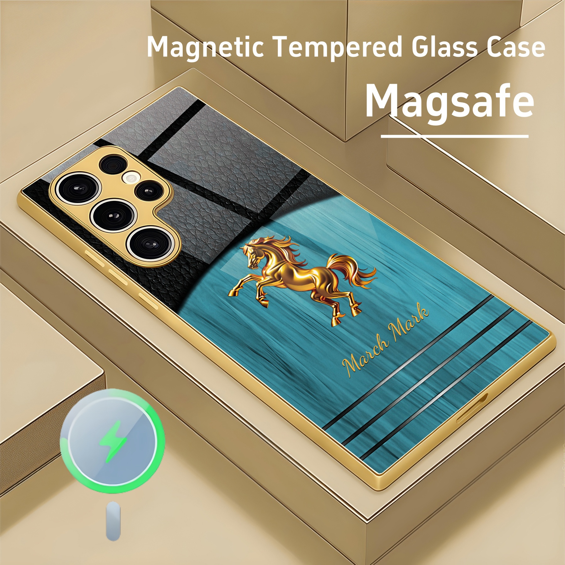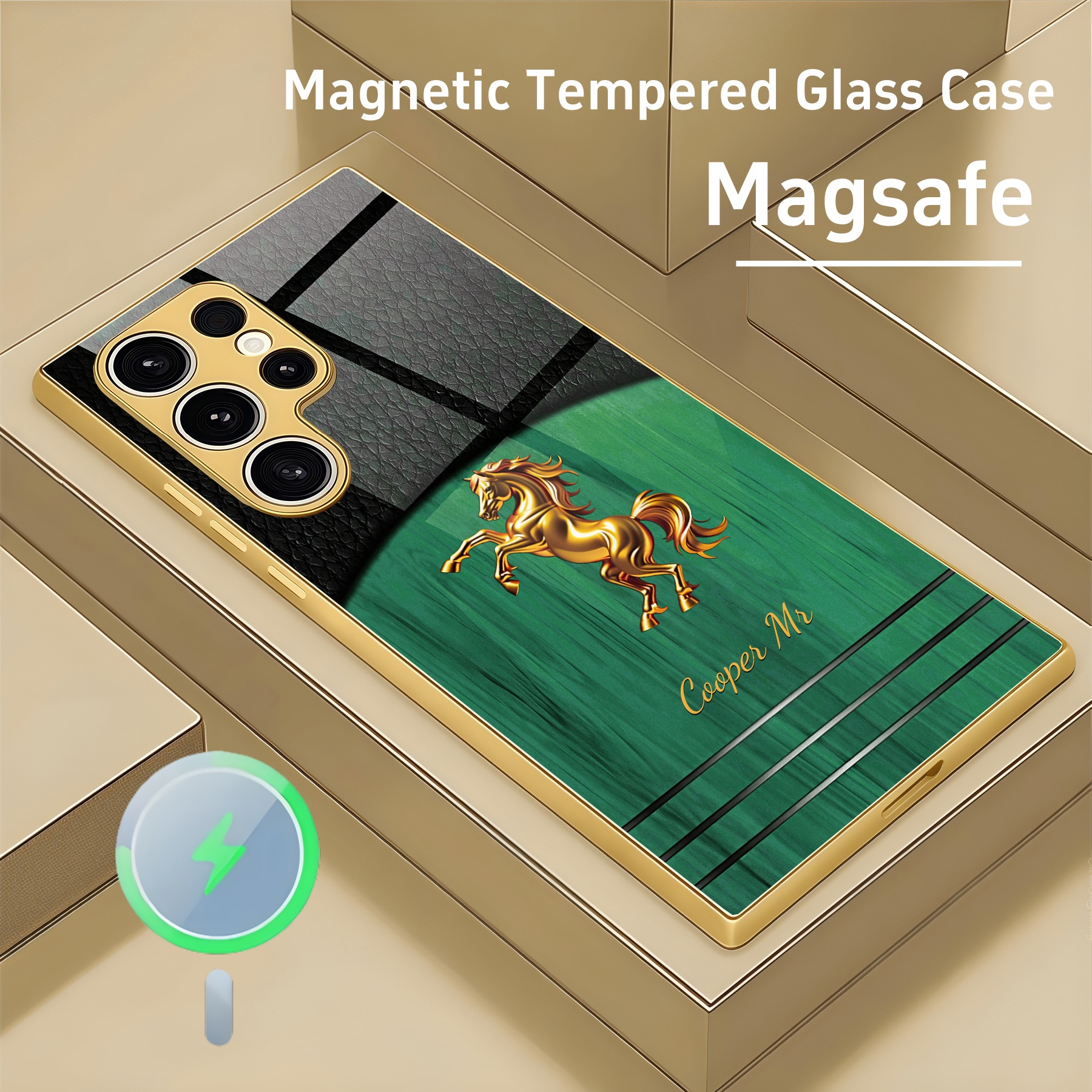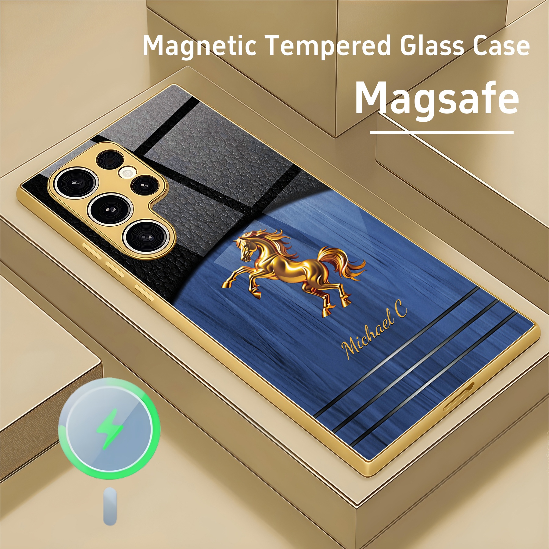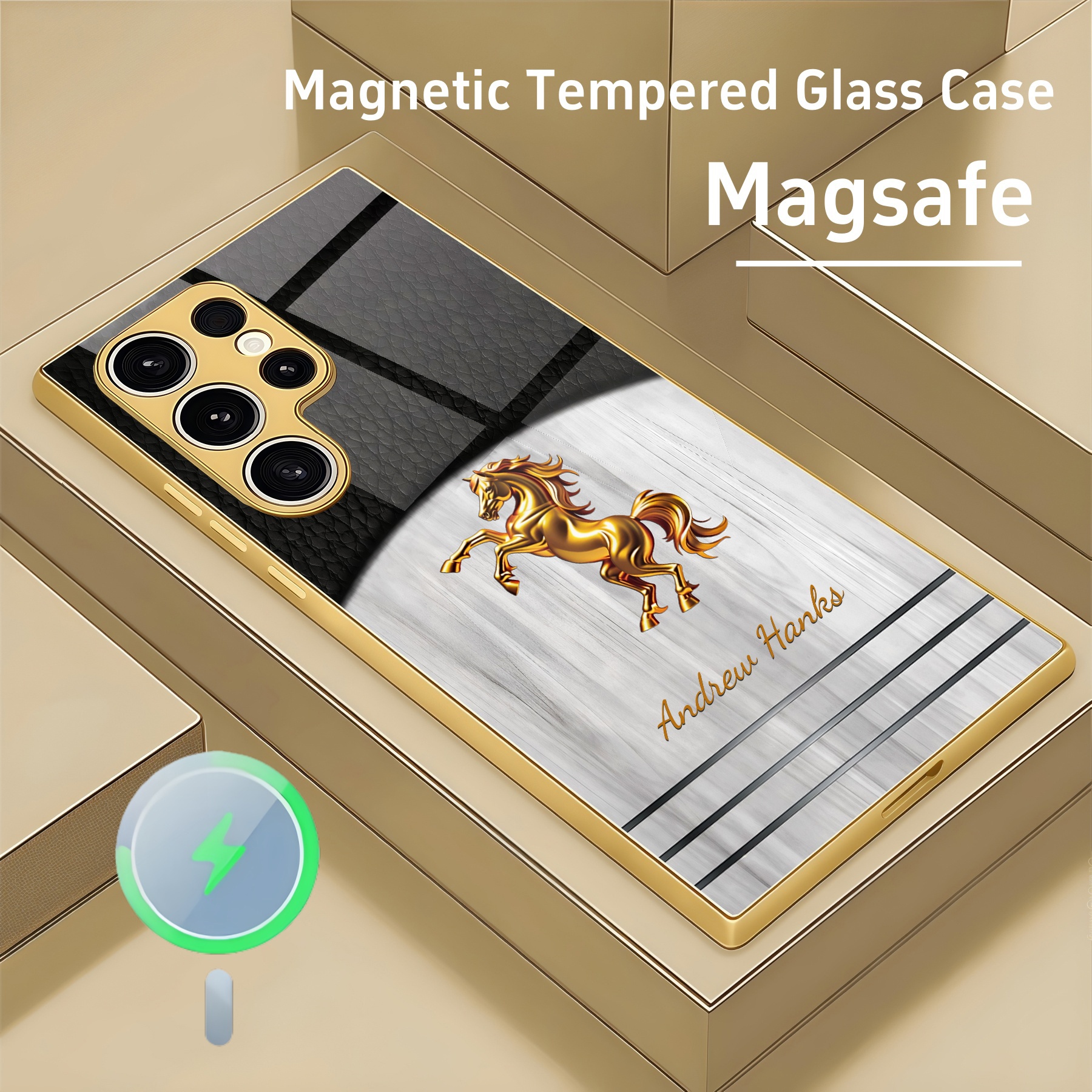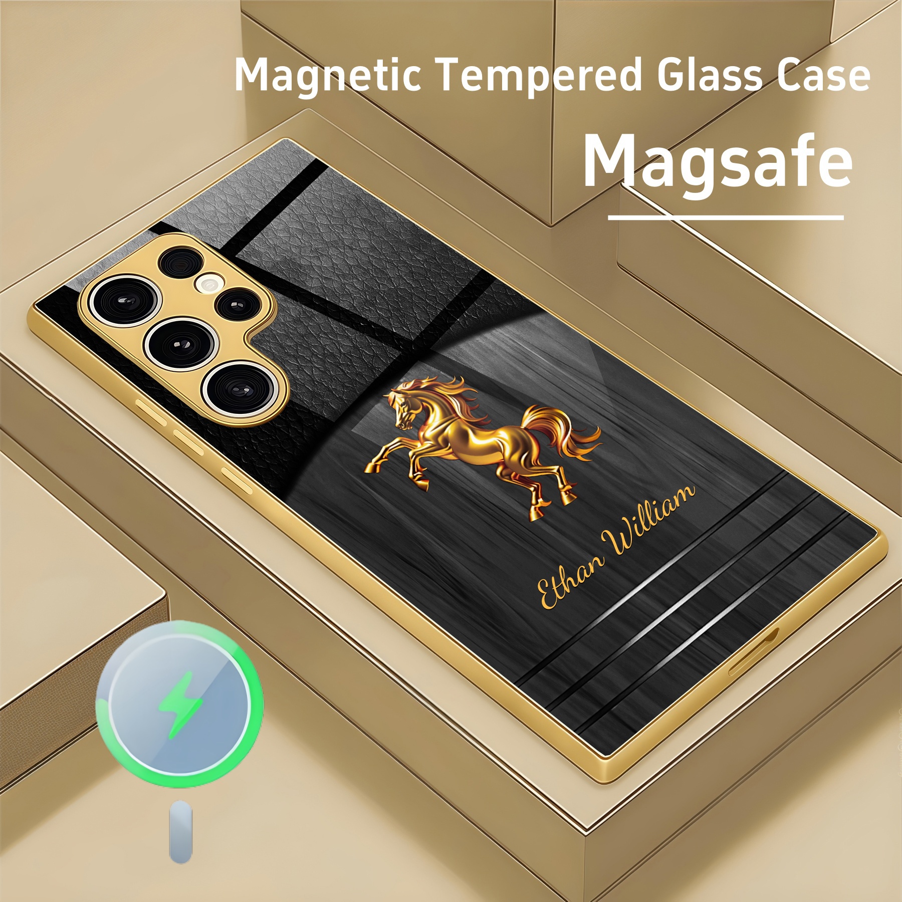 Personalized Leather Wood Grain Horse Magsafe Tempered Glass Case